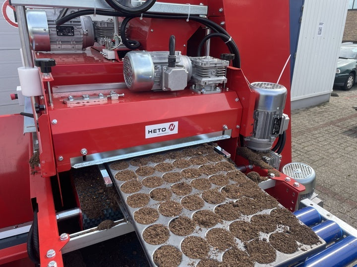 HETO Tray filler with tray compaction unit. Compaction performed by a propeller that guarantees high and even compaction at 600 trays / hour.