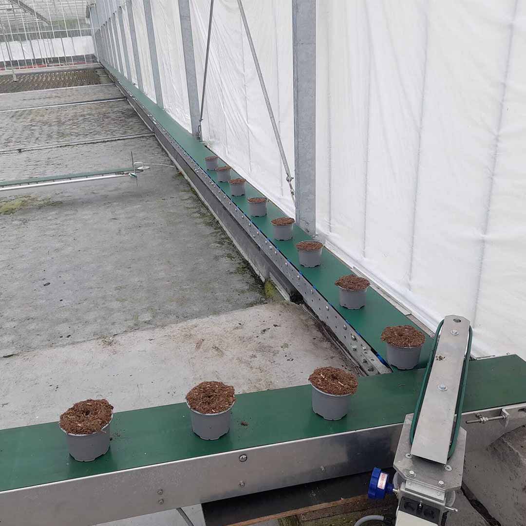We delivered a 70-meter-long gable conveyor, which allows pots to be transported directly into the greenhouse. This means the Javo potting machine can remain in a fixed position and no longer needs to be moved around inside the greenhouse.